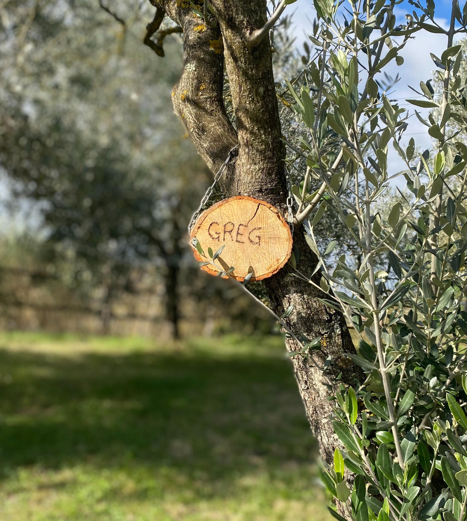 Choose your olive tree from our family grove in the hills of Siena — a landscape shaped by centuries of care and tradition.Once chosen, your tree becomes yours alone, a living symbol of patience and continuity. You give it a name — a dedication to someone you love, a memory, or a message for the future.That name is engraved onto a handcrafted plaque placed at on your tree, and you receive an official Certificate of Adoption as a lasting testament to your connection with this land.